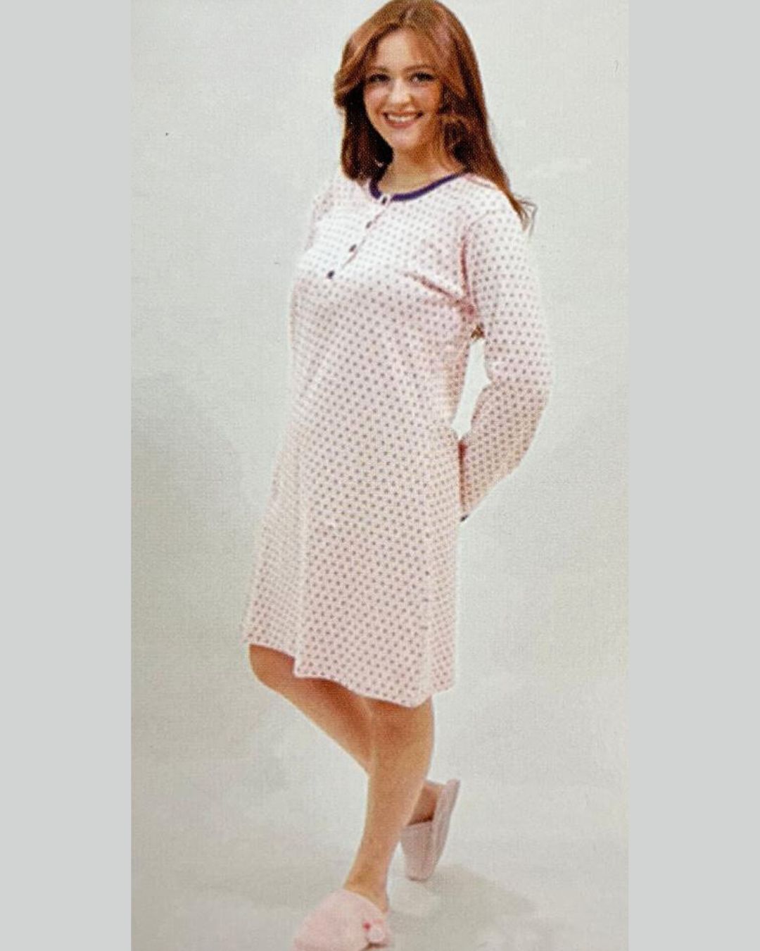 Camicia da notte in caldo cotone, manica lunga, scollo serafino con quattro bottoni.