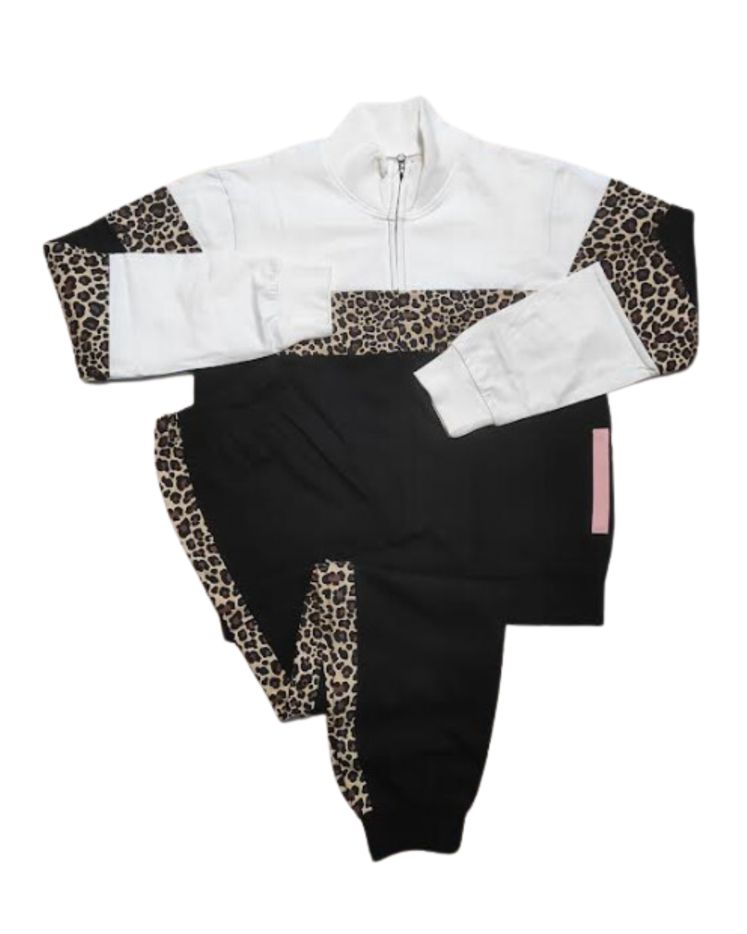 Pantalone tinta unita con fascia laterale a fantasia leopardata, tasche e molla con laccio in vita, polsini elasticizzati.