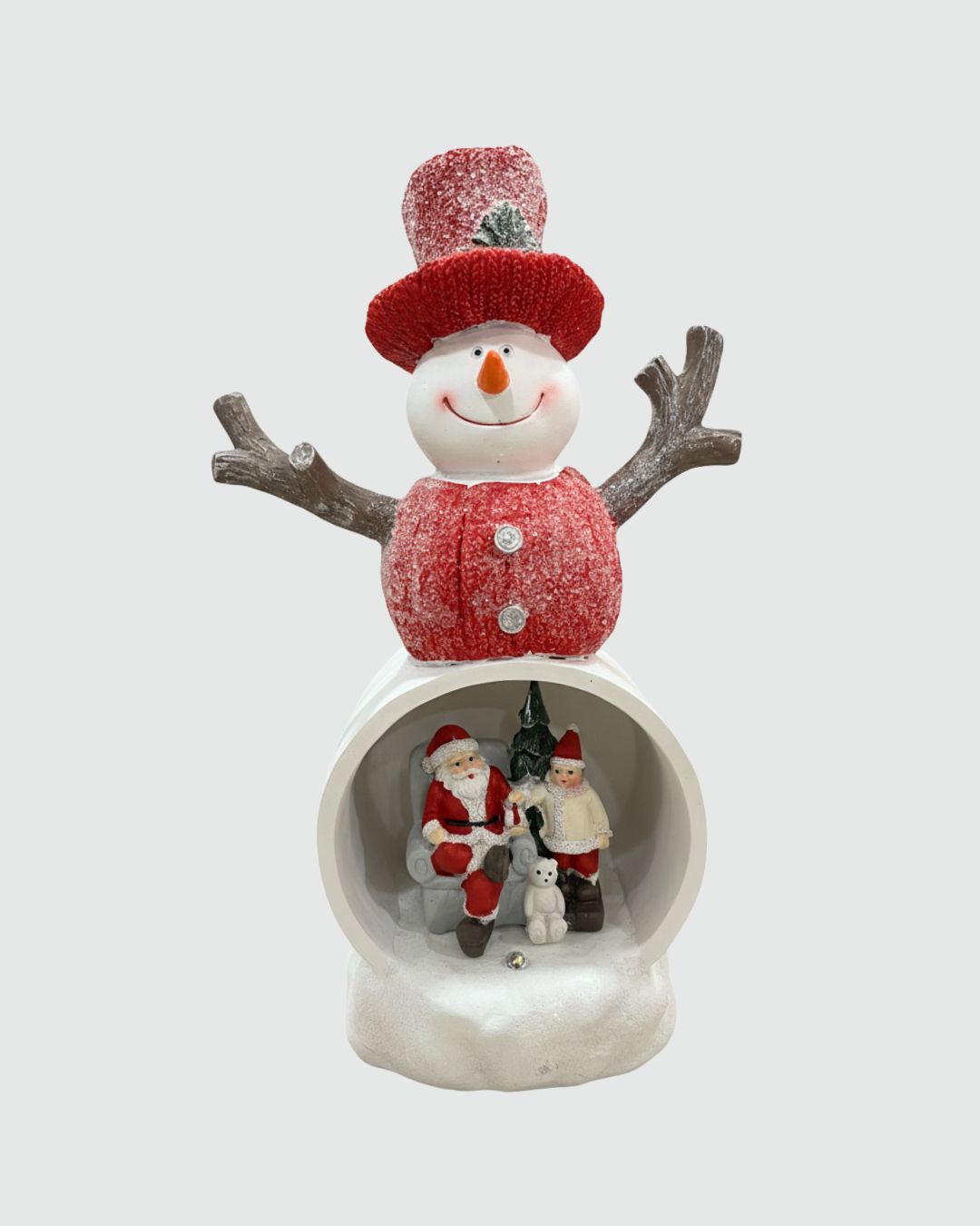 - Scena Interna Dettagliata: La base del pupazzo ospita una suggestiva ambientazione con Babbo Natale, un piccolo aiutante, un orsetto polare e un albero di Natale.