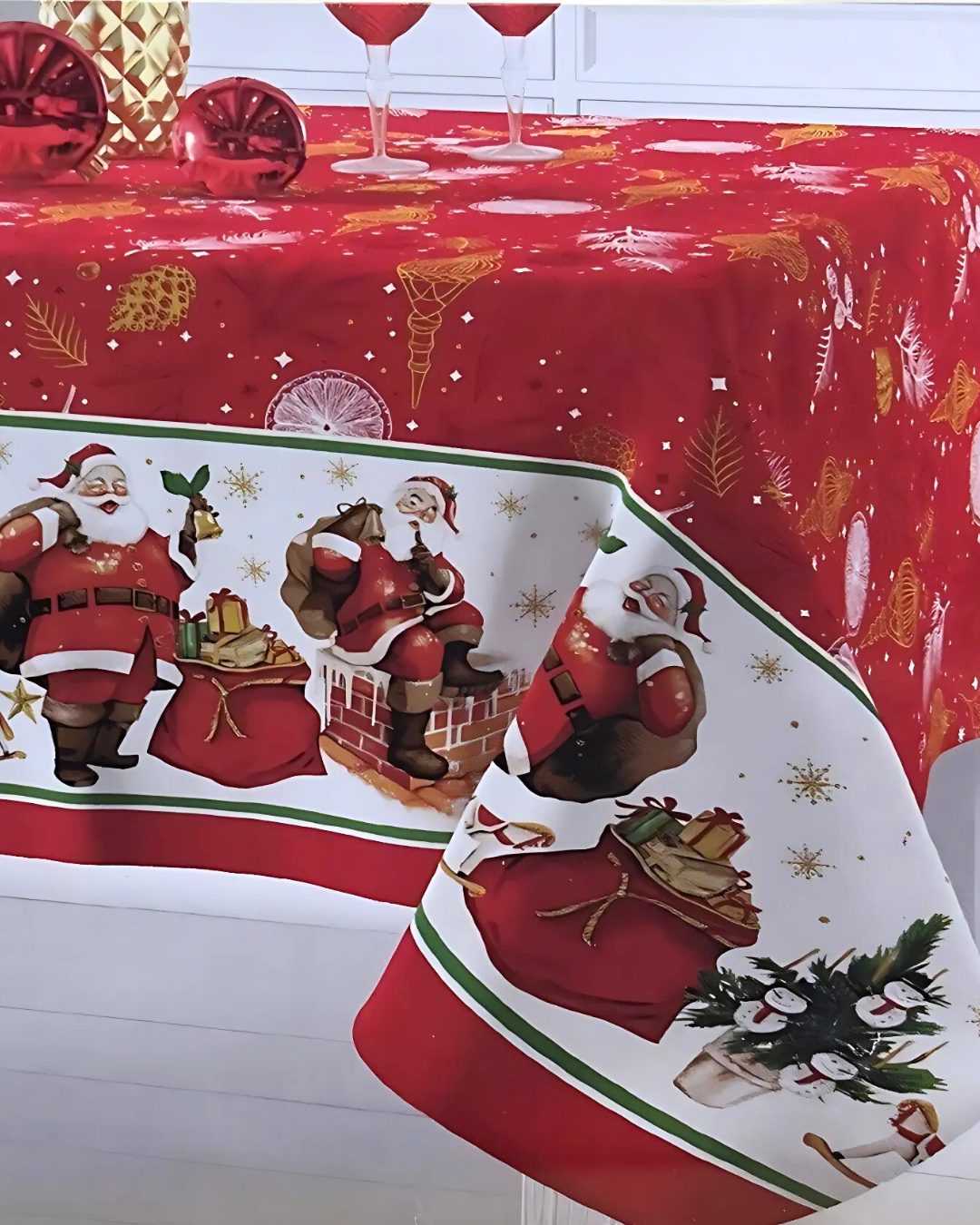 Tovaglia natalizia 18 posti in rasatello di cotone. Misure: 140×360 cm. Lavaggio max 30°.