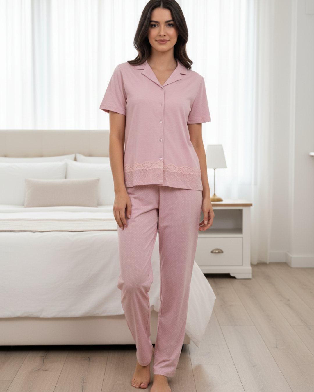 - Camicia a Maniche Corte: Stile classico con collo a revers e abbottonatura frontale. Il tocco di romanticismo è dato dal delicato pizzo che orna l'orlo, aggiungendo un dettaglio femminile e sofisticato.