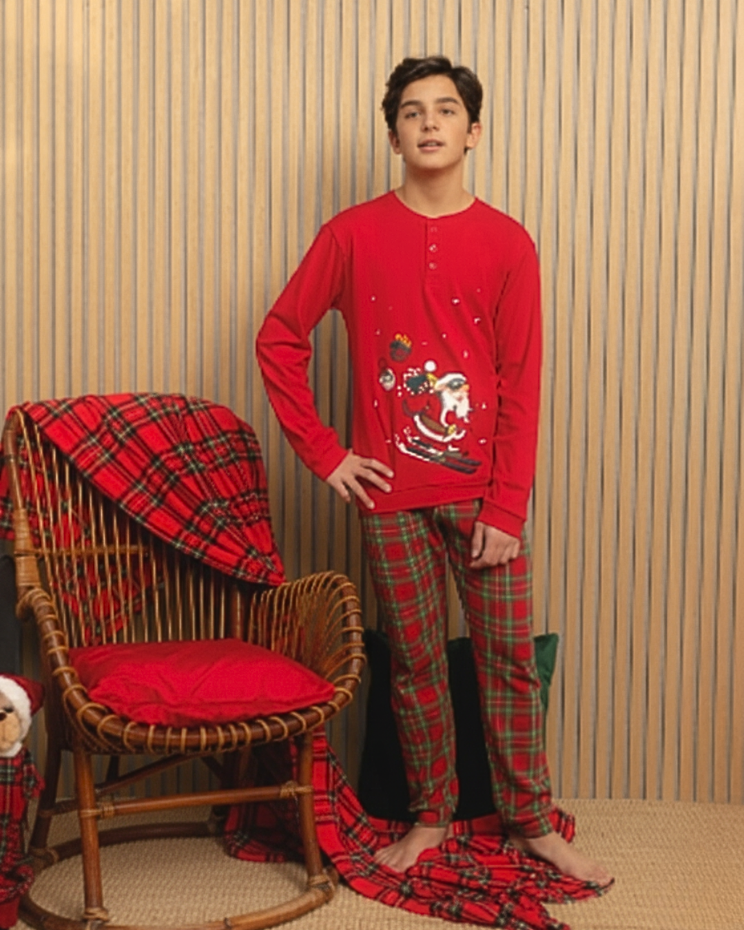 Preparati a vivere la magia del Natale con il massimo comfort e stile! Questo pigiama natalizio a quadri è perfetto per i ragazzi che amano l'atmosfera delle feste, ideale per rilassarsi a casa, divertirsi con gli amici o celebrare la Vigilia in un look a tema.