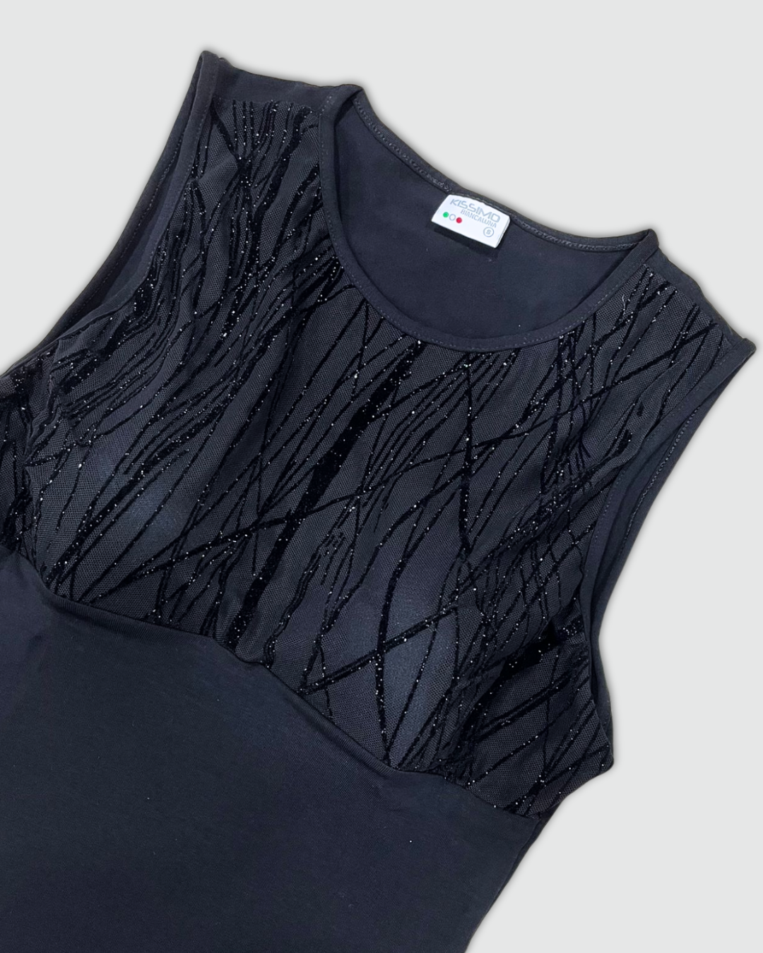 Questa canotta nero è un must-have che unisce comfort e glamour. La parte inferiore è in morbido tessuto elasticizzato, mentre lo scollo è impreziosito da un raffinato inserto in tulle nero trasparente.