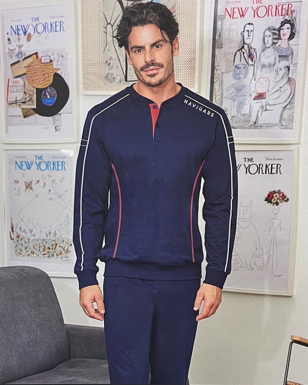 Maglia manica lunga con scollo serafino e bottoni, polsini elasticizzati e dettagli di righe a contrasto.