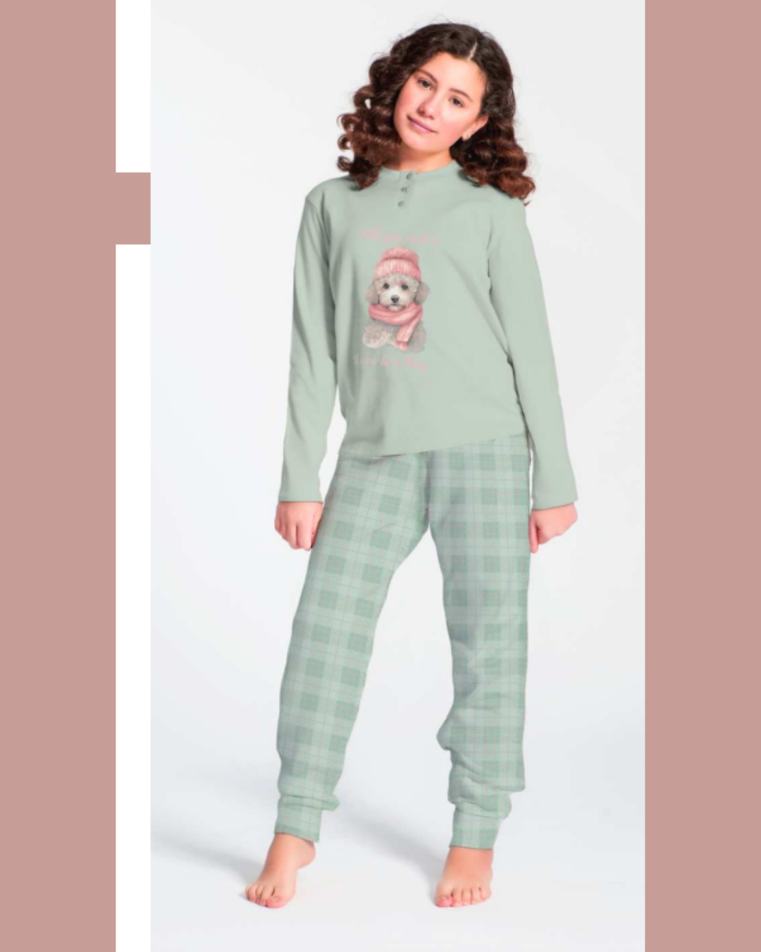 Un set irresistibile che unisce comfort estremo a un design adorabile. La maglia a maniche lunghe, con pratico scollo a bottoni, presenta la stampa centrale di un dolcissimo cagnolino e lo slogan che scalda il cuore: "All you need is love & a dog".