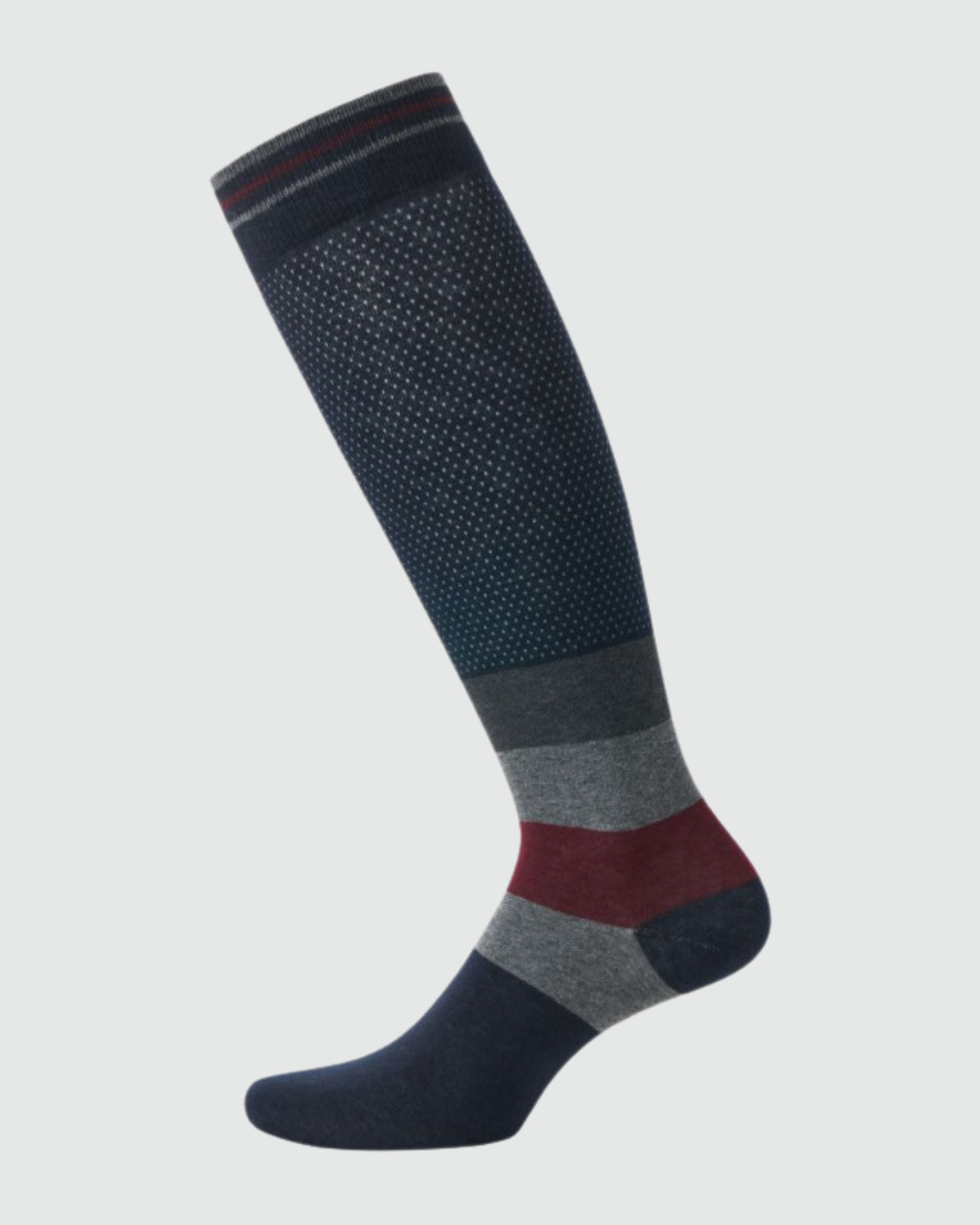 Calze lunghe uomo con cotone, fantasia righe in contrasto, punta e tallone rinforzati, bordo comfort e punta chiusa con rimaglio.