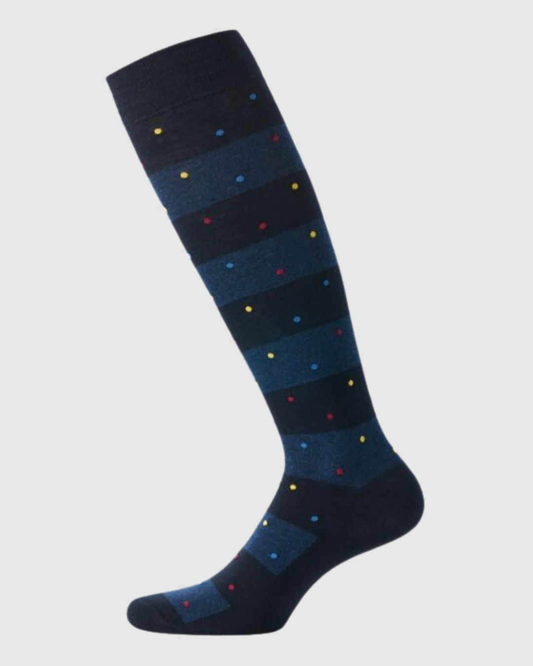 Calze lunghe uomo con cotone a fantasia pois multicolore su fondo a strisce tono su tono.