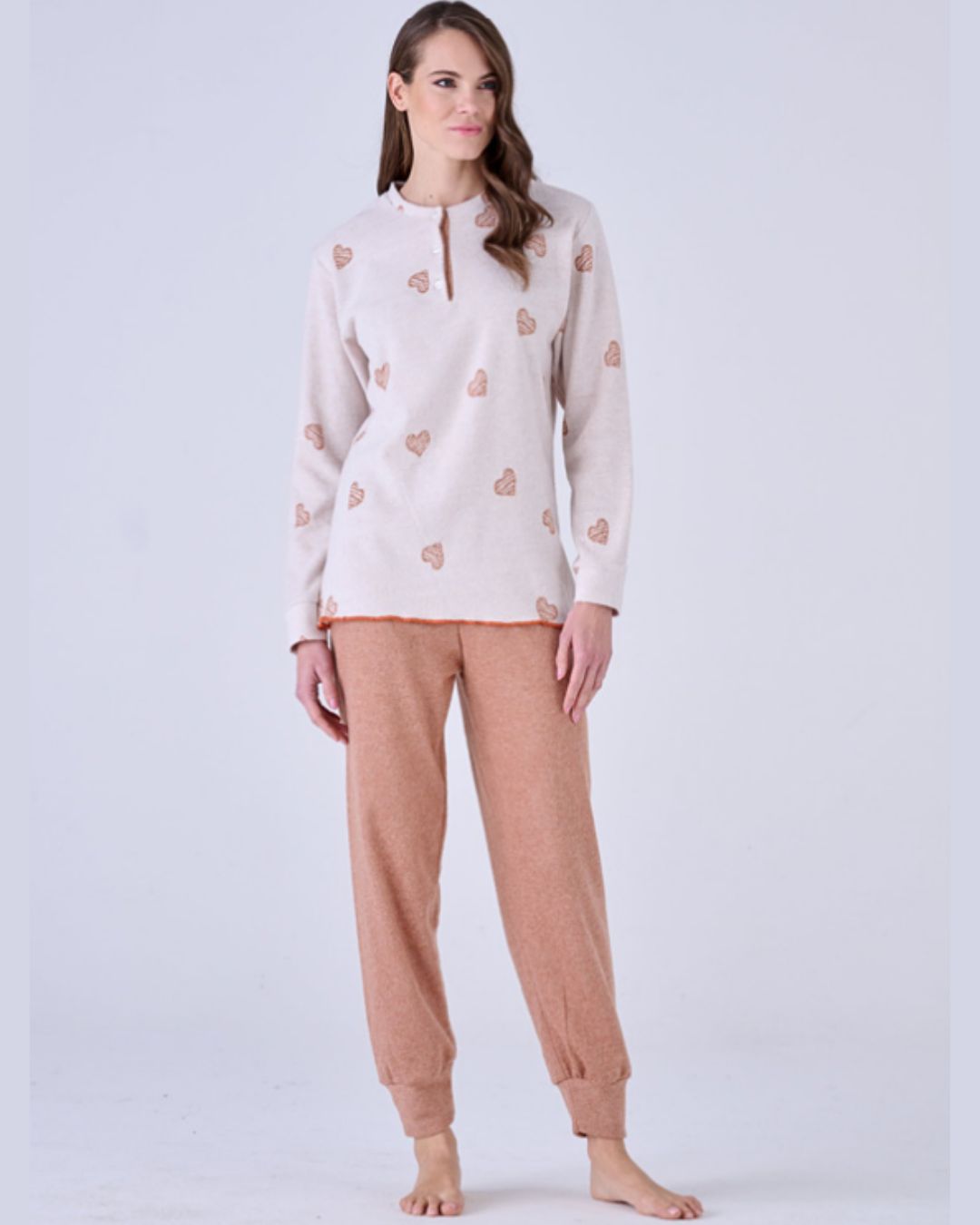 Maglia a fantasia cuori, scollo serafino con tre bottoni e manica lunga con polsini.
