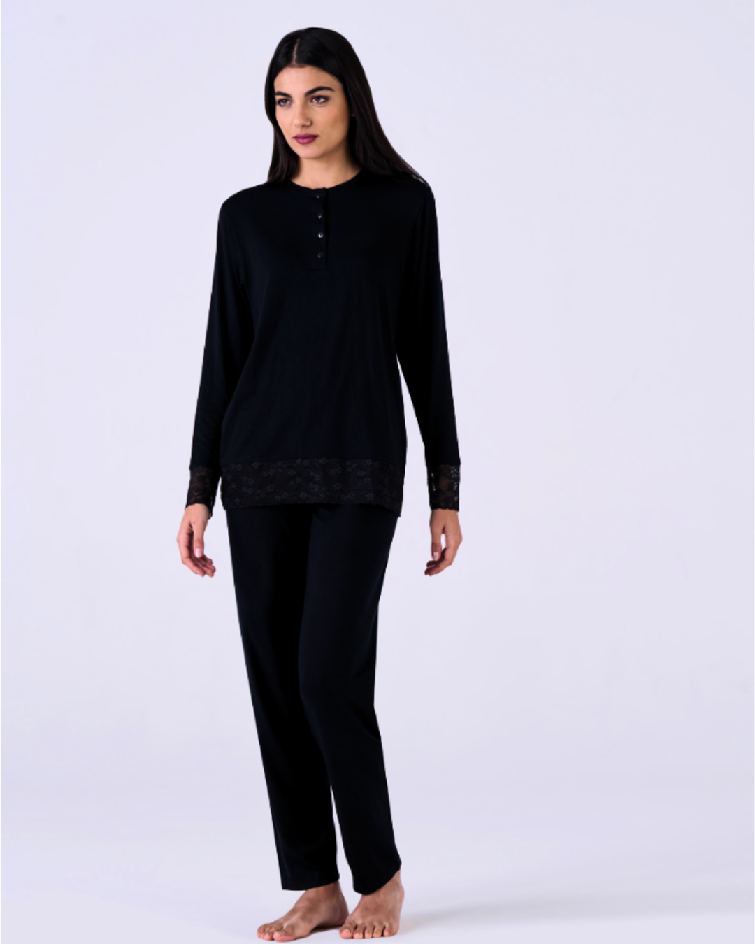 Pigiama donna viscosa modal Maglia serafino con due bottoni e polsini in pizzo.