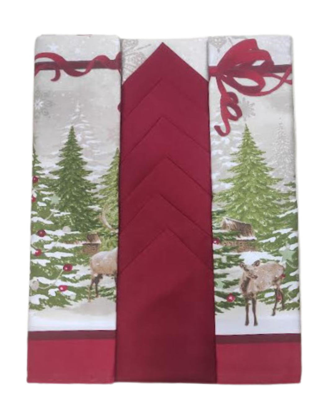 Tovaglia Natalizia in rasatello stampato 12 posti + tovaglioli. Elegante e pratica, perfetta per le tue feste. Un regalo speciale. Composizione 50% cotone 50% poliestere. Made in Italy.