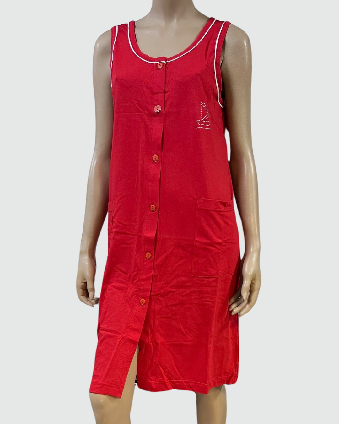 Abito da mare spalla larga in cotone, con apertura completa avanti.