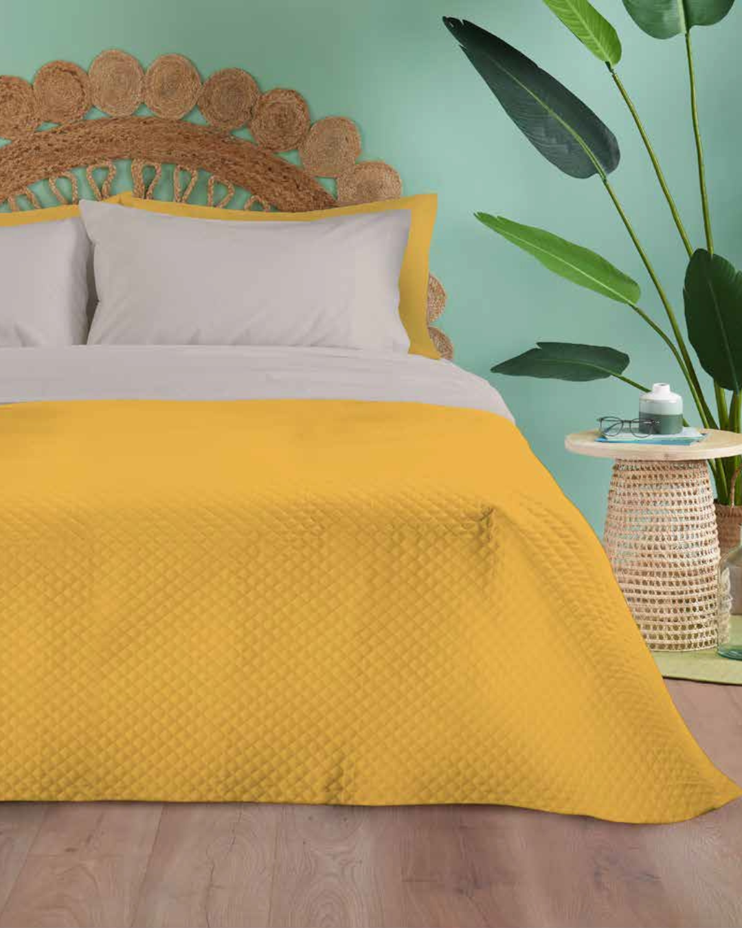 Quilt matrimoniale mezza stagione a tinta unita, con trapuntatura a quadri e angoli tondi.
