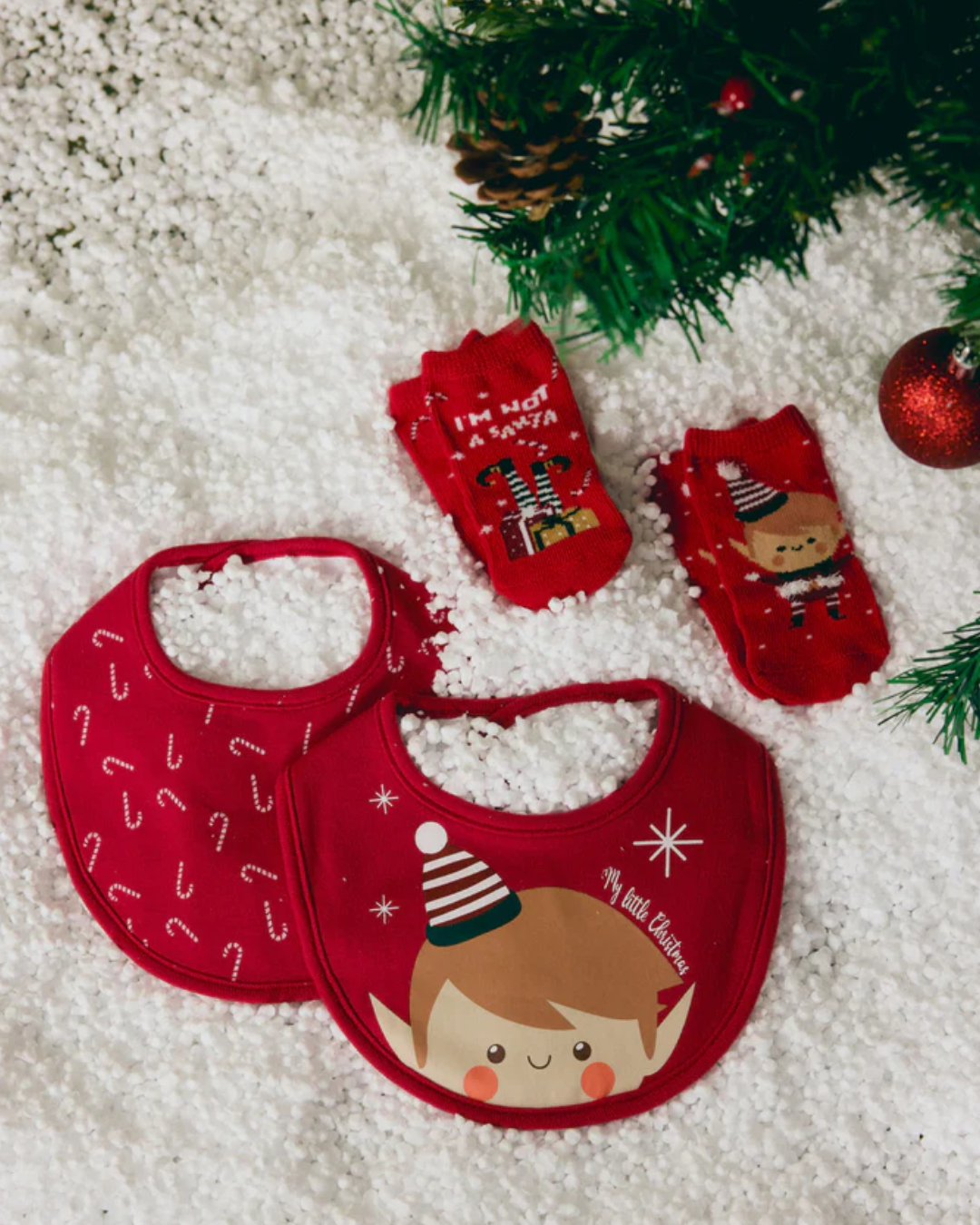 - Design Festivo: Il primo bavaglino sfoggia una tenera stampa dell'Elfo di Natale con la scritta "My Little Christmas", ideale per le foto delle Feste. Il secondo presenta un divertente pattern di bastoncini di zucchero.