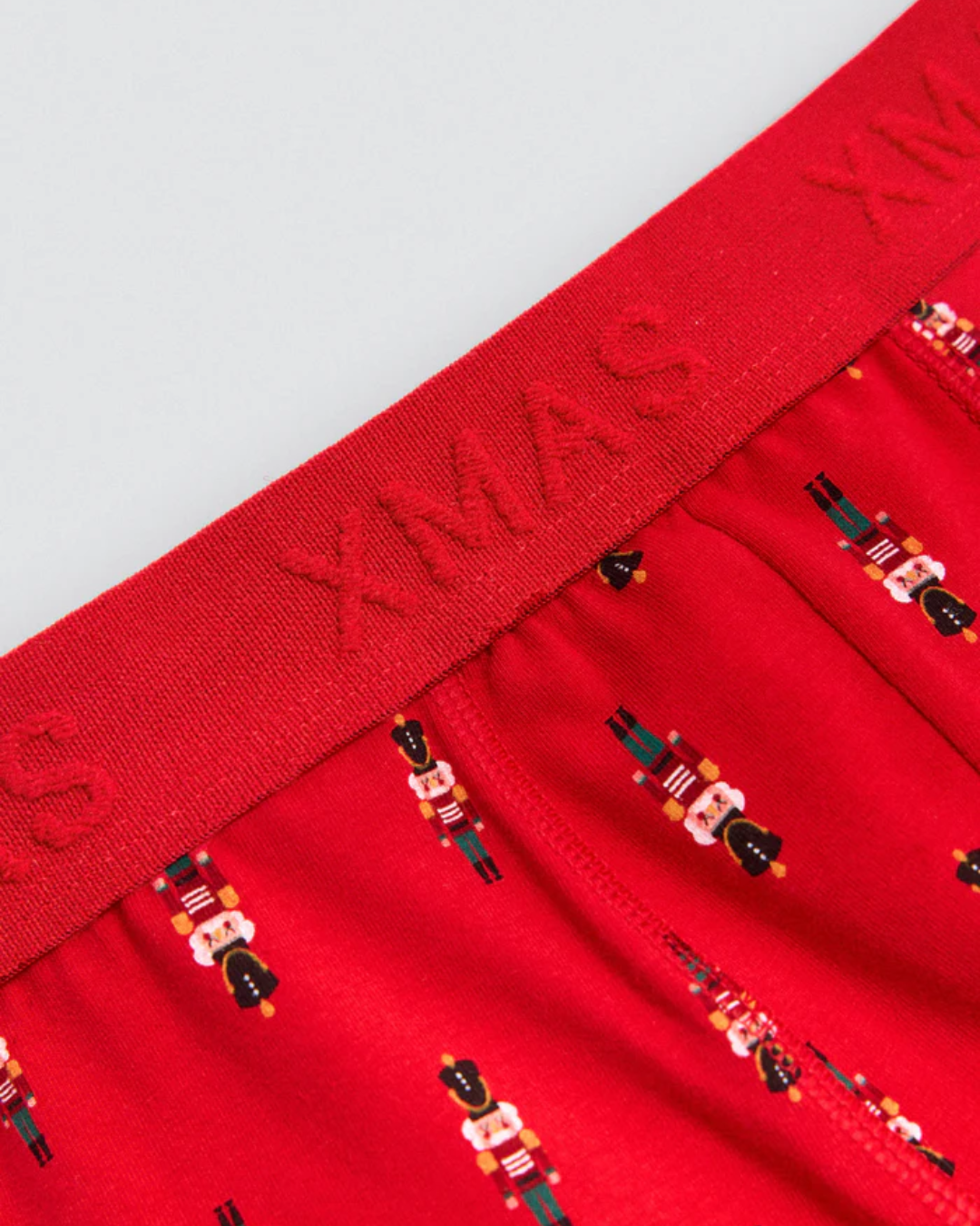 - Stile Unico: La stampa a tema di Soldatini Schiaccianoci su fondo rosso vivo è un classico natalizio, resa moderna e cool per i più grandi. L'elastico in vita riporta la scritta "XMAS", un dettaglio di tendenza.