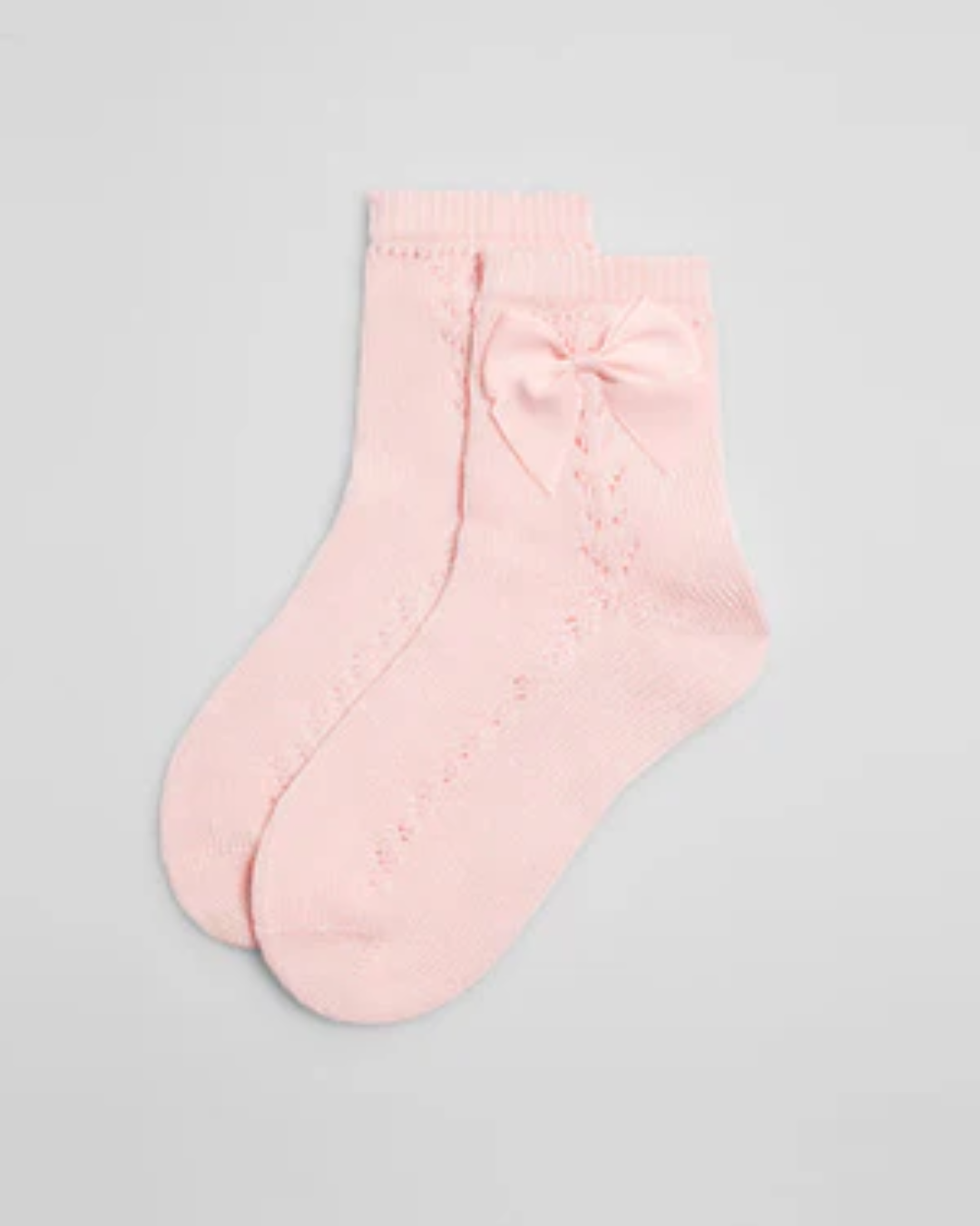 Calzini corti traforati per neonati, lavorati a maglia in morbido cotone e delicatamente tagliati a mano.