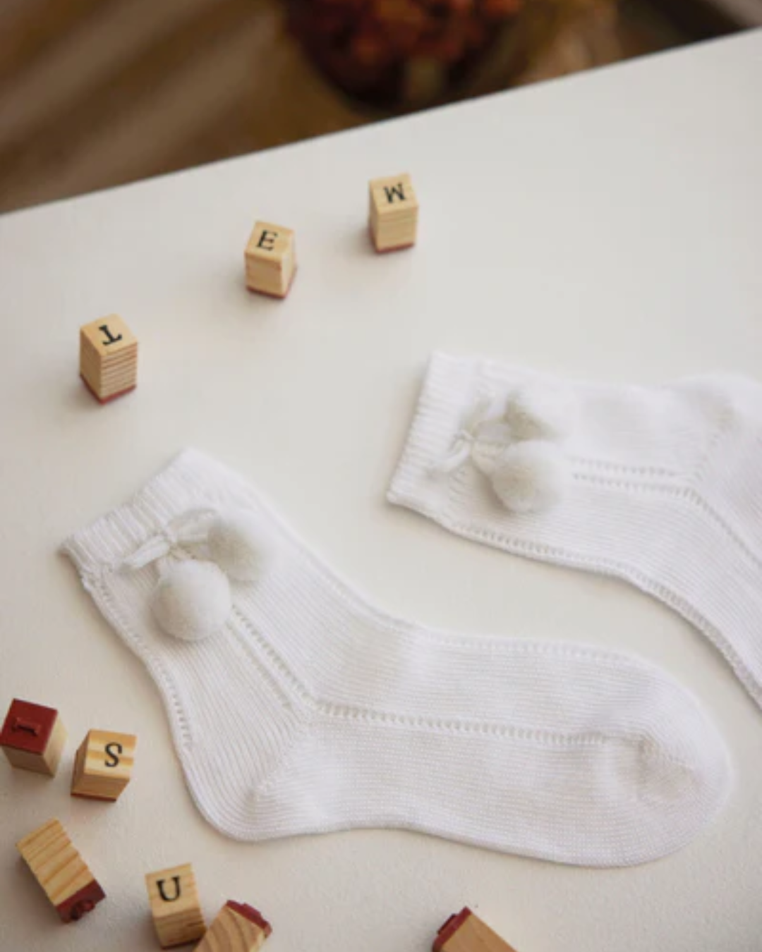 Calzini corta traforati per neonati, lavorati a maglia in morbido cotone e delicatamente tagliati a mano.