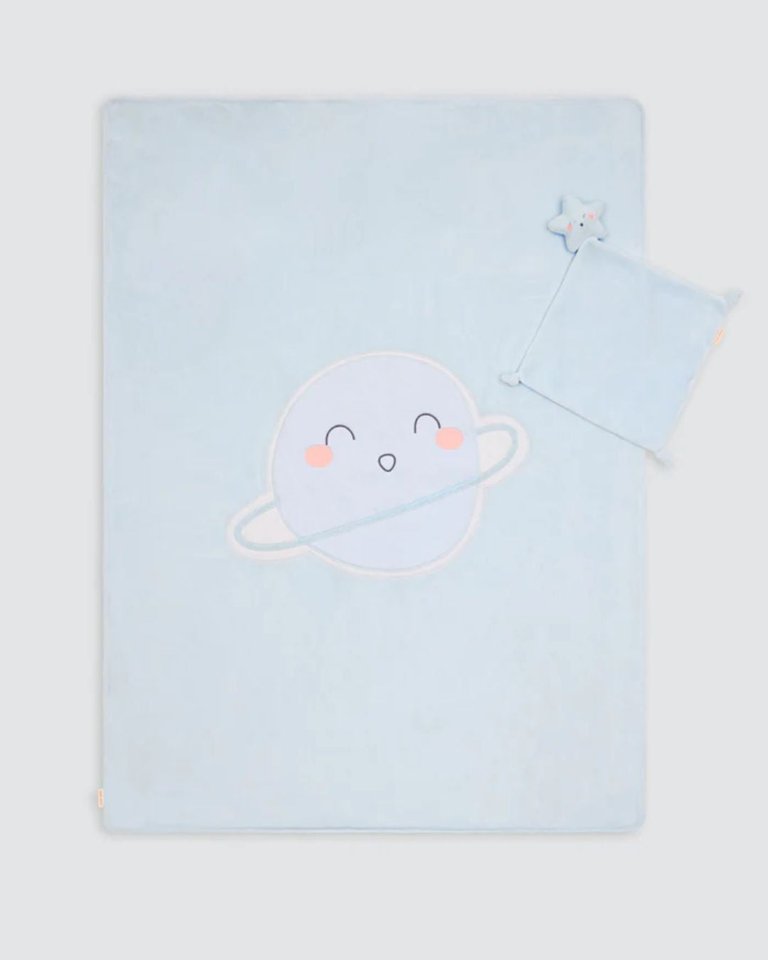 - Coperta Lussuosa: Realizzata in morbidissimo tessuto peluche color azzurro. La coperta è di dimensione perfetta per la culla, il passeggino o per le coccole sul divano. È impreziosita dal ricamo pianeta e stelle, un tocco di eleganza discreta.